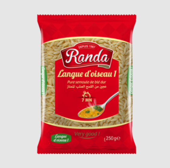 Découvrez les Langue d’Oiseau Randa, des pâtes fines et courtes traditionnelles tunisiennes fabriquées à partir de semoule de blé dur de haute qualité. Parfaites pour préparer vos chorbas, potages et recettes familiales, elles cuisent rapidement tout en gardant leur tenue et leur saveur. Conditionnées en sachet de 500 g, ces pâtes apportent la touche authentique de la cuisine tunisienne à vos repas quotidiens. Commandez en ligne sur epicerie-shop.ca et savourez la qualité et l’authenticité des pâtes tunisiennes !